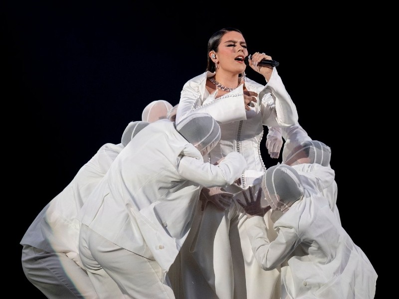 Yuval Raphael sings for Israel with her arms outstretched at the 2025 Eurovision Song Contest