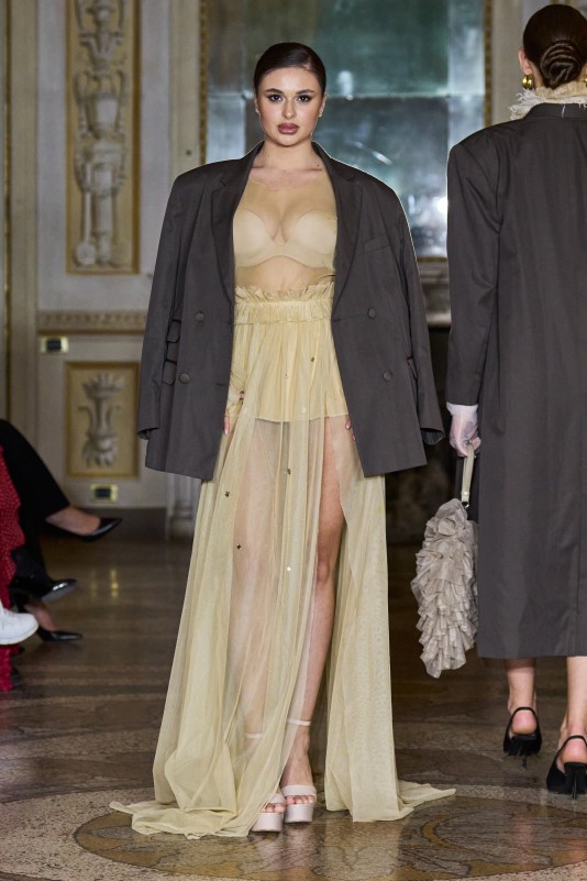 Ia Goniadze presented a vision of modern couture rooted in the philosophy of exclusivity and timeless refinement. A refined palette of muted gold and black framed the collection, while corseted waists, architectural ruffles, and sheer, weightless layers created a dialogue between structure and fluidity. Handcrafted textiles and meticulously constructed silhouettes highlighted the house’s devotion to individuality — each look existing as a singular work rather than a repeatable design. Balancing classic elegance with a distinctly modern edge, the collection embodied a quiet, confident luxury, reaffirming Ia Goniadze’s long-standing philosophy that true couture begins where uniqueness becomes absolute.