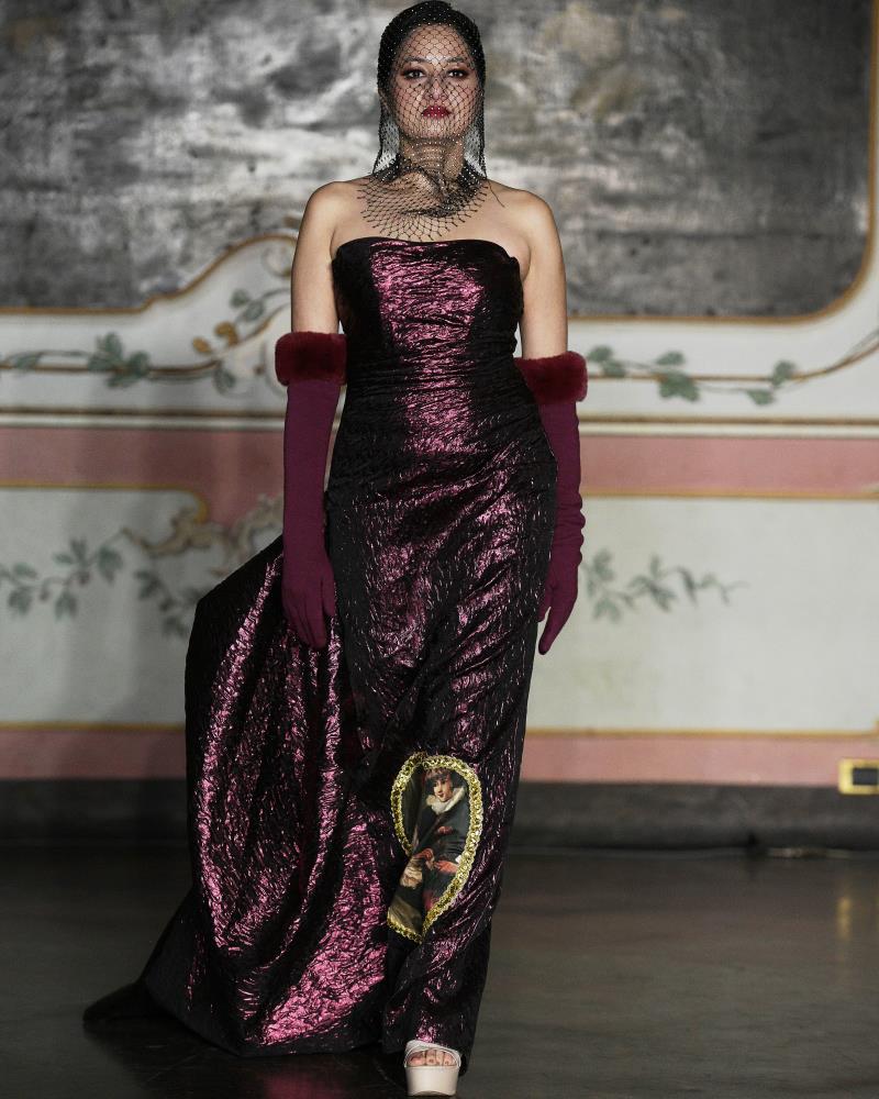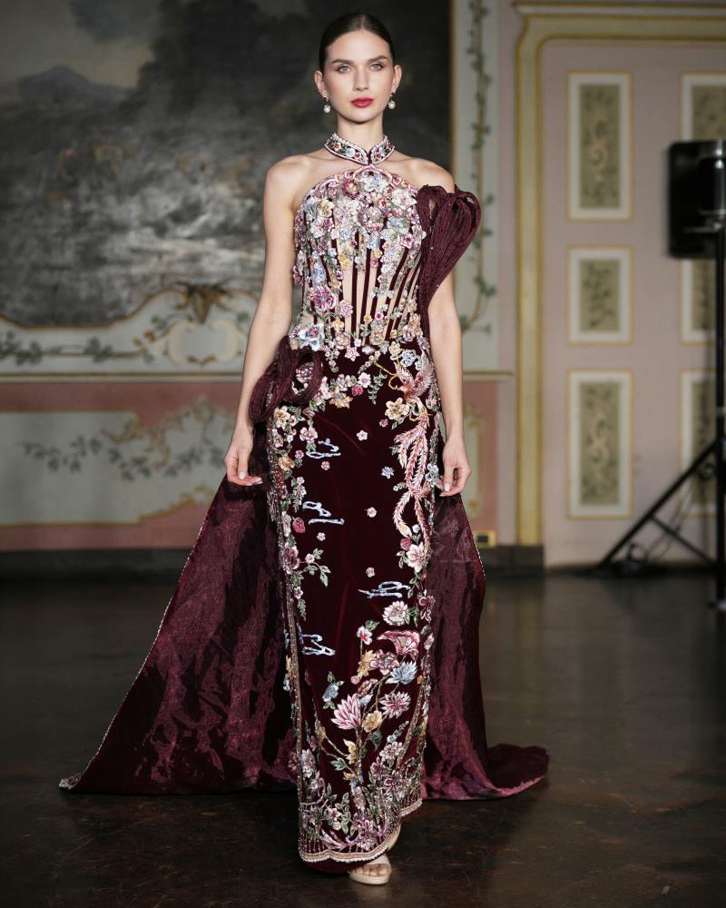 Paroma-Àla-Mode, founded by Paromita Ghosh, delivered a deeply personal couture statement where heritage, femininity, and theatrical elegance converged. Working in a dramatic palette of bordo and black, the collection unfolded through sculpted velvet silhouettes, fluid draping, and intricate surface embellishments that balanced sensuality with strength. Statement hats, corseted structures, and layered textures introduced a sense of modern vintage glamour.