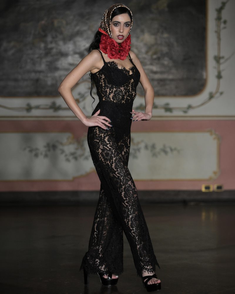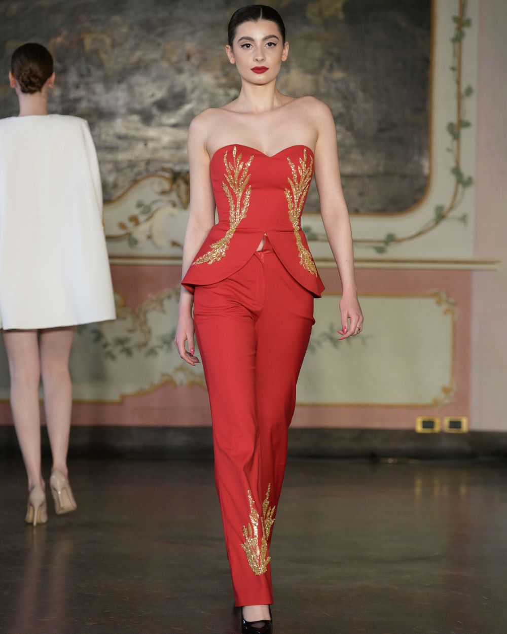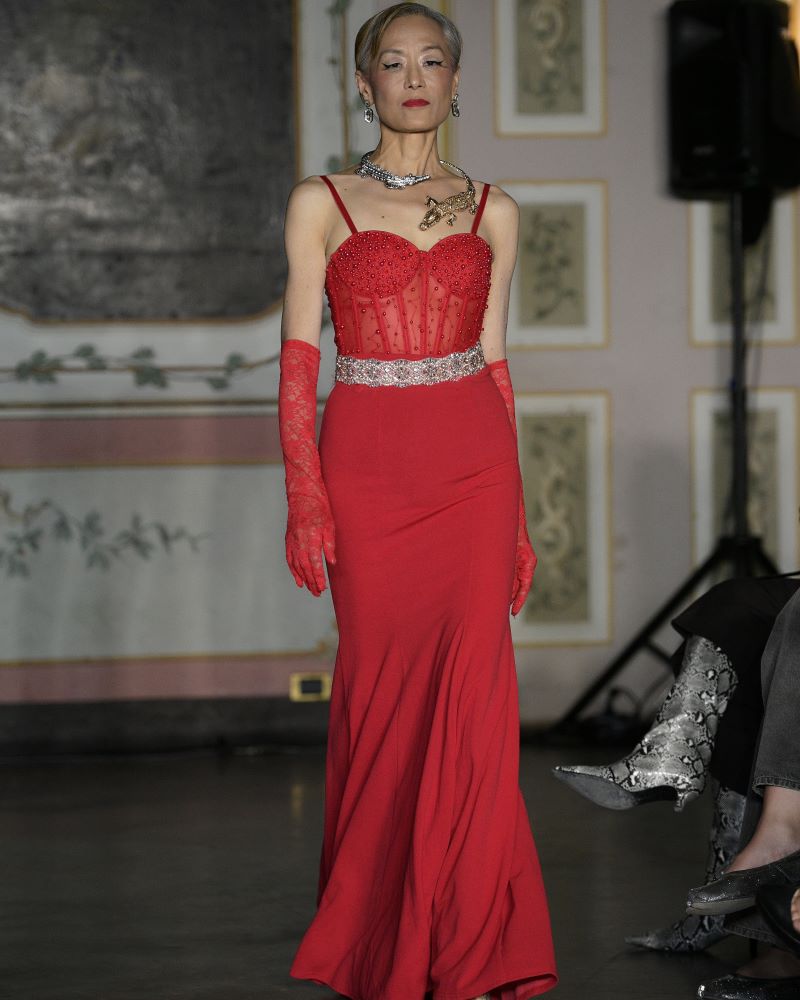House of Rina unveiled Le Donne Di Rosso, a tribute to women everywhere — honoring their courage, resilience, and transformative power. More than a presentation of garments, the show unfolded as an emotional journey, capturing the layered nature of modern womanhood, where softness and strength exist in perfect harmony. A deliberate dialogue between shadow and fire defined the palette: deep black lace, chiffon, satin, and velvet spoke of untold stories and inner fortitude shaped by experience, while silhouettes in defiant red charmeuse, organza, georgette, and fluid silk emerged as a collective voice of visibility and solidarity. The red pulsed with life and purpose, symbolizing courage and the unbreakable bond between women who rise together. Subtle crystal and pearl embellishments highlighted the precision of couture craftsmanship, as the contrast between structured velvet and weightless chiffon mirrored vulnerability and power coexisting within a single, commanding vision.